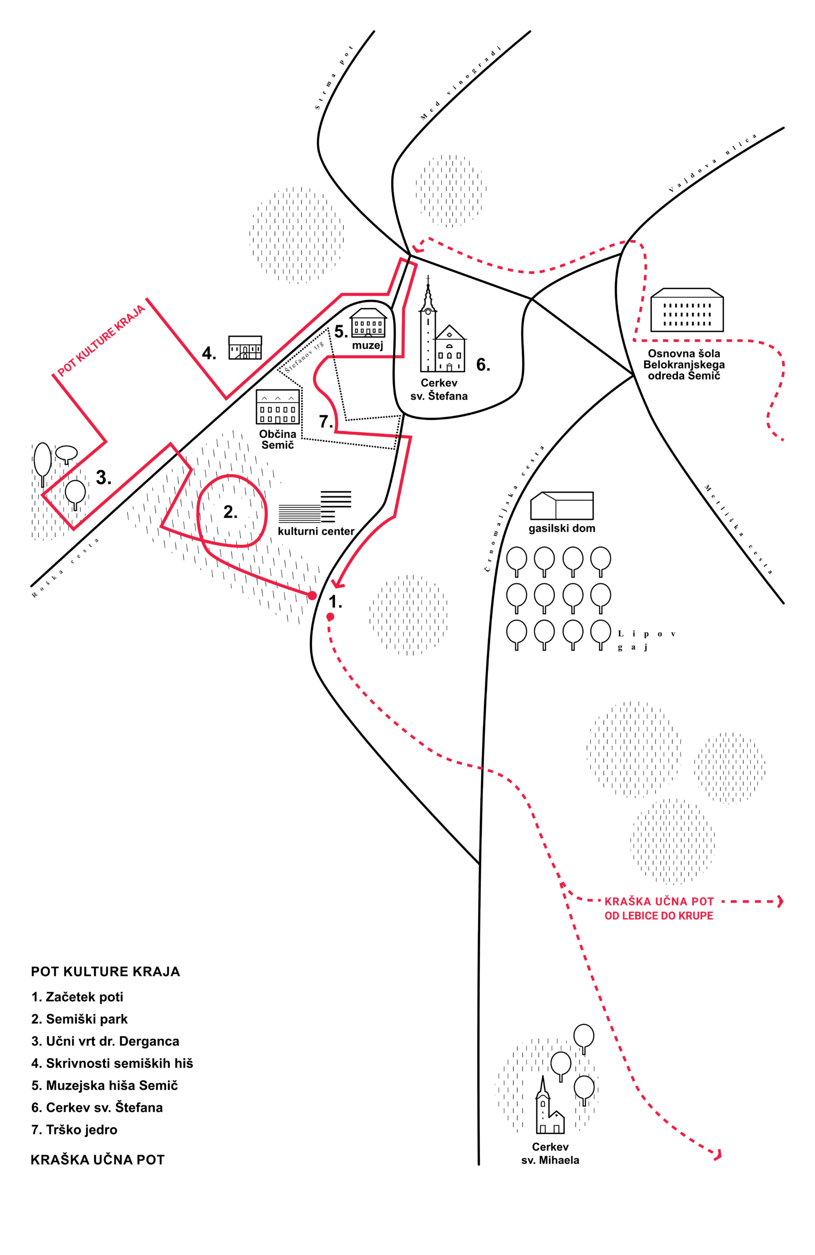 Pot kulture kraja je vaš zemljevid po Semiču – vodi vas skozi njegove plasti in zgodbe. Te se skrivajo med belimi brezami, v vinskih kleteh, bogati kulturni zgodovini, neokrnjeni naravi in pristnih ljudeh. Semič se odpira skozi narečje, okus kruha, barvo zidov in šepet gozda. Začutite toplino gostoljubja, utrip narave in živost kulture. Vstopite skozi vrata Bele krajine, kjer dediščina postane oder sedanjosti.